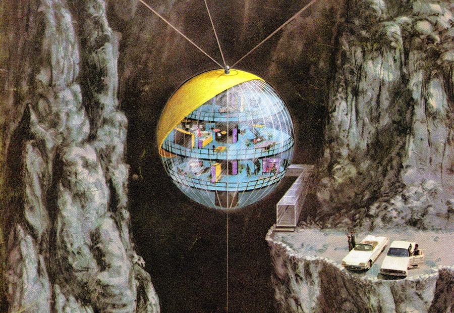 To use an ungainly compound analogy, these look like what might have happened if Syd Mead had studied with Frank Lloyd Wright, or as if we’re glimpsing a kind of prairie modernism timidly trying on the garb of science fiction.