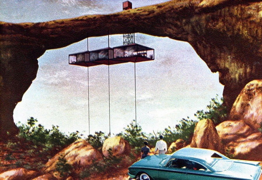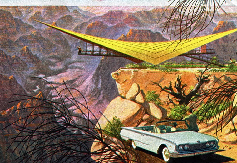 Elsewhere, extraordinary cantilevers stretch like the prows of exotic ships over postcard-ready landmarks, and the whole series has the feel of a rather wholesome advertising campaign for the National Park service—complete with conspicuously well-placed Ford automobiles reminding you that the future is only one or two rest stops away.
