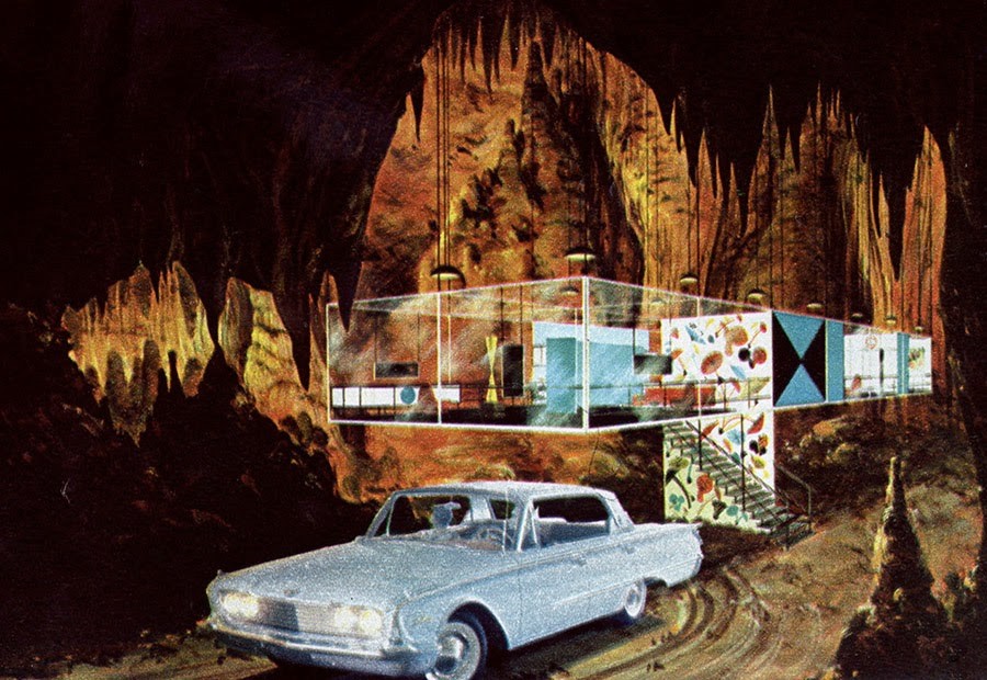 Minimalist cubes are suspended on cables from vast geological forms and glass houses pop up unexpectedly in the deepest recesses of American show caves.
